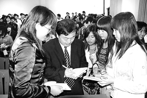 5月14日下午,周口市“青年創(chuàng)業(yè)行動(dòng)”青年典型事跡巡回報(bào)告會(huì)在周口某高校舉行。報(bào)告會(huì)后,青年創(chuàng)業(yè)典型正在為學(xué)生簽名?! 。ū?攝)