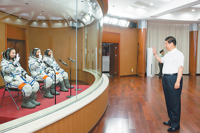 6月11日,中共中央總書記、國家主席、中央軍委主席習近平在酒泉衛(wèi)星發(fā)射中心觀看神舟十號載人飛船發(fā)射。這是習近平向即將出征的航天員聶海勝、張曉光、王亞平揮手致意。 新華社記者 李學仁攝 |