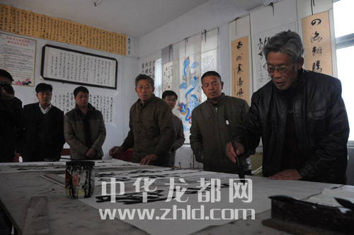 ????作為距離太康縣城最遠(yuǎn)的一個(gè)邊界鄉(xiāng)鎮(zhèn),轉(zhuǎn)樓鄉(xiāng)的文化活動(dòng)開(kāi)展得有聲有色。該鄉(xiāng)依托文化站,成立了在鄉(xiāng)一級(jí)少見(jiàn)的文聯(lián),下設(shè)書(shū)法家協(xié)會(huì)、腰鼓協(xié)會(huì)、嗩吶協(xié)會(huì)等。我們?cè)谵D(zhuǎn)樓鄉(xiāng)政府采訪時(shí),正碰上書(shū)法家協(xié)會(huì)20多名會(huì)員在一起切磋書(shū)藝。今年74歲的許家榮是鄉(xiāng)書(shū)法家協(xié)會(huì)主席,也是《周口晚報(bào)》的老讀者,看到我們到來(lái),老人興之所至,當(dāng)場(chǎng)揮毫潑墨,為本報(bào)題寫(xiě)了“周口邊界行接地氣有人氣”的條幅。據(jù)了解,每逢春節(jié),書(shū)法家協(xié)會(huì)會(huì)員都會(huì)走村串戶(hù),為村民義務(wù)書(shū)寫(xiě)春聯(lián)。