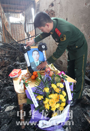 ????正月十五元宵節(jié),人們齊聚在鄭春光犧牲的那間不大的商鋪門前,在那間已經(jīng)被熏黑的墻壁上掛上潔白的小花:“鄭春光你是人民的好兒子”、“春光我們永遠(yuǎn)懷念你!”、“春光一路走好!”字字真情、句句感動(dòng),表達(dá)著人們對(duì)這位好男兒的無(wú)限哀思。人們端來(lái)了熱騰騰的湯圓放在鄭春光犧牲的門前,所有的人們面對(duì)春光犧牲的地方,為他們心中的英雄深深地鞠了三躬。一位淚流滿面的老人哽咽著:“春光,好孩子,我給你送元宵來(lái)了!好孩子,你吃點(diǎn)吧!吃點(diǎn)吧!”在場(chǎng)的人們哭聲一片。