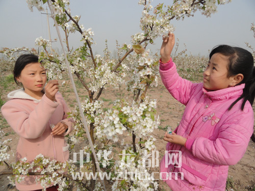 ???????4月12日,商水縣舒莊鄉(xiāng)北王張村的小學(xué)生在自家的梨園為梨花授粉。星期天,該村的小學(xué)生紛紛跑到梨園欣賞盛開的梨花,幫助家長為梨花授粉,享受著在梨花中勞動(dòng)的樂趣。