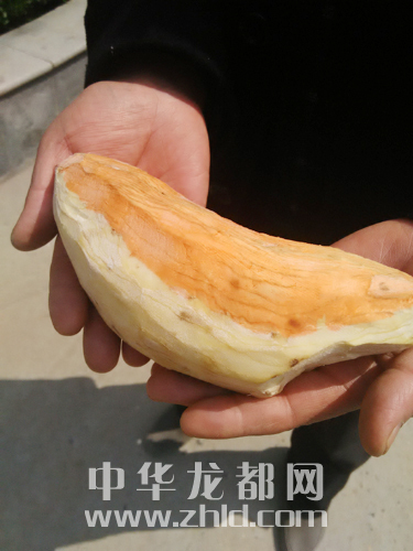 ?  近日,淮陽縣居民林樹松買到了一塊“混血”紅薯,紅薯一半是牙白色,一半是橘紅色。整塊紅薯長約23厘米,最粗處直徑約22厘米。因?yàn)閾?dān)心紅薯基因變異,林先生沒敢食用這塊紅薯。為此,記者采訪了周口師范學(xué)院生命科學(xué)與農(nóng)學(xué)學(xué)院院長陳龍。陳教授說,紅薯是塊莖類作物,不像小麥、大豆那樣,它不是種子,所以基本上不存在基因變異的情況。一塊紅薯出現(xiàn)兩種顏色,應(yīng)當(dāng)是正?,F(xiàn)象,市民可以食用?! ⊥韴?bào)記者 朱海龍 攝
