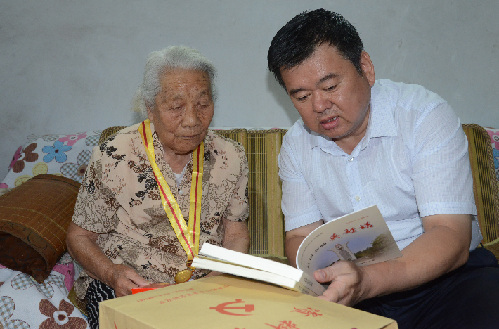 ????徐光一行先后來到抗戰(zhàn)老戰(zhàn)士老同志郭純義、張明鐸、王琪的家中,親切看望慰問他們,把黨和政府對(duì)抗戰(zhàn)老戰(zhàn)士老同志的關(guān)心傳遞到每個(gè)人心中。每到一處,徐光都與他們深入交談,了解他們的生活、起居、身體等情況,與老戰(zhàn)士、老同志一起回憶革命戰(zhàn)爭(zhēng)時(shí)期的崢嶸歲月,共話革命精神的傳承,祝愿他們健康長(zhǎng)壽、生活幸福。慰問過程中,徐光滿懷崇敬之情,為抗戰(zhàn)老戰(zhàn)士老同志們佩戴由中共中央、國(guó)務(wù)院、中央軍委聯(lián)合頒發(fā)的“中國(guó)人民抗日戰(zhàn)爭(zhēng)勝利70周年”紀(jì)念章,送上慰問金和黨史書籍。徐光動(dòng)情地說:“明天就是中國(guó)人民抗日戰(zhàn)爭(zhēng)和世界反法西斯戰(zhàn)爭(zhēng)勝利70周年紀(jì)念日,我代表市委、市政府來看望問候你們,并向你們致以崇高的敬意和良好的祝愿??箲?zhàn)年代,廣大老戰(zhàn)士、老同志出生入死、不怕犧牲、英勇奮斗,為奪取抗戰(zhàn)勝利立下了不朽的功勛,你們是人民的英雄、國(guó)家的功臣,沒有你們的犧牲奉獻(xiàn),就沒有我們今天的幸福生活,黨和人民永遠(yuǎn)不會(huì)忘記你們。紀(jì)念抗戰(zhàn)勝利,就是要弘揚(yáng)偉大的抗戰(zhàn)精神,凝聚起實(shí)現(xiàn)周口崛起、富民強(qiáng)市、全面建成小康社會(huì)的強(qiáng)大力量,不斷把周口的各項(xiàng)事業(yè)推向前進(jìn)。”