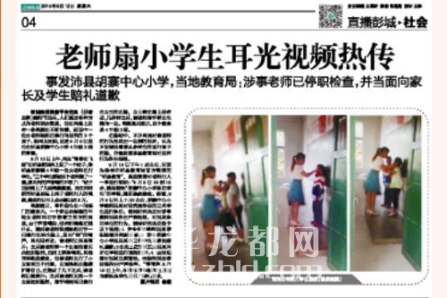 在等待調(diào)查結(jié)果的同時,記者通過網(wǎng)絡(luò)積極尋找與該視頻相關(guān)的信息。9月12日17時許,記者在當(dāng)天的《彭城晚報(bào)》上看到一則標(biāo)題為《老師扇小學(xué)生耳光視頻熱傳》的消息,報(bào)紙上刊登的圖片為視頻中的截圖。據(jù)報(bào)道,該事件發(fā)生在江蘇省徐州市沛縣胡寨中心小學(xué)。9月9日7時30許,胡寨中心小學(xué)老師吳某對沒有完成作業(yè)的3名學(xué)生進(jìn)行體罰,后被人舉報(bào)。目前,涉事學(xué)校和老師已向家長和學(xué)生賠禮道歉。