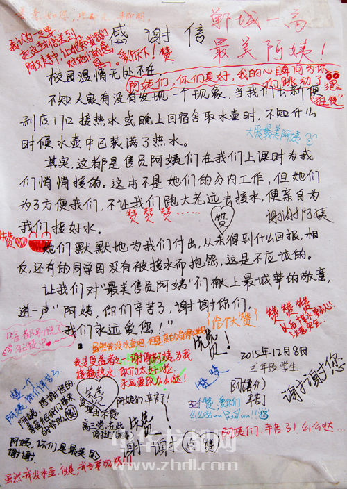 ????不少學(xué)生在這封感謝信上留言表達(dá)敬意和謝意:“贊”、“給個(gè)大贊”、“我是受益者之一,謝謝阿姨為我接滿熱水,你們太好啦”、“阿姨們辛苦了”、“謝謝您”……