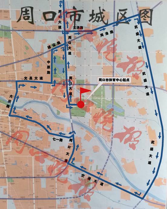 ????賽事初步確定報名參賽總?cè)藬?shù)為1萬人,其中,全程馬拉松2000人,半程馬拉松2000人,迷你馬拉松6000人。比賽路線(如圖)暫定為:市體育中心(起點(diǎn))——周口大道——北高速口轉(zhuǎn)折——太清路——周淮路——武盛大道——周項路——周口大道——七一路——大慶路——文昌大道——中原路——建設(shè)路——周口大道——市體育中心(終點(diǎn))。