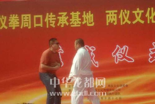 ????當(dāng)日,在兩儀拳周口傳承基地揭牌和兩儀文化周口發(fā)展中心落成儀式上,兩儀拳傳承人分別做了兩儀拳展示和兩儀養(yǎng)生功夫表演。隨后,段保華的弟子高躍鑫請(qǐng)現(xiàn)場(chǎng)觀眾上臺(tái)體驗(yàn)兩儀拳點(diǎn)穴。一位身材高大、體重近100公斤的彪形大漢應(yīng)聲上臺(tái)。彪形大漢與高躍鑫交流后,表示已準(zhǔn)備完畢。話音剛落,彪形大漢就被點(diǎn)中穴道,立即倒地。讓人驚奇的是,解穴后,彪形大漢隨即恢復(fù)正常?!耙郧奥犝f過兩儀拳的威力很大,沒想到會(huì)這么大?!北胄未鬂h說。