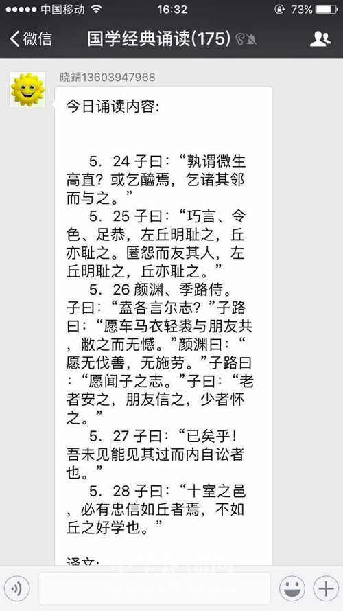????建立該微信群的是團(tuán)市委工作人員劉曉靖。劉曉靖告訴周口晚報(bào)記者,建立該微信群的目的是想讓大家多讀讀國學(xué)經(jīng)典,增加大家的文學(xué)涵養(yǎng),讓大家養(yǎng)成讀書的習(xí)慣。“剛開始只有十幾個(gè)人,大家有些不好意思,有的人覺得自己讀得不好張不開口,我就做一些示范,引領(lǐng)大家誦讀。不久,加入微信群的人多了,通過幾個(gè)人帶動(dòng),大家誦讀的就多了?!眲跃刚f,讀的方式就是大家通過微信的語音功能,讀一些《論語》中的經(jīng)典句子。過了一段時(shí)間,大家對這種方式越來越認(rèn)可,加入該微信群的人也越來越多,人數(shù)從剛開始的十幾個(gè)人增加到近200人?,F(xiàn)在,該微信群里不但有電臺、電視臺的專業(yè)主持人,而且有一些學(xué)者。以前拿不準(zhǔn)的字,現(xiàn)在都會(huì)有人講解,大家也有了學(xué)習(xí)對象。這個(gè)微信群從成立到現(xiàn)在,《弟子規(guī)》、《大學(xué)》、《中庸》、《論語》已讀一遍,四書里面只剩下《孟子》還沒有讀。