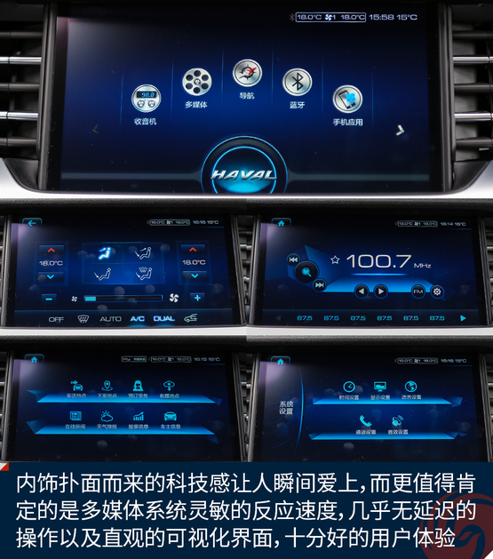 如果說外觀給了你第一重驚喜,那么內(nèi)飾的設計一定超乎了你對自主品牌的認知,至少我認為,全新哈弗H6上的這套內(nèi)飾,在設計上已經(jīng)超越了很多合資品牌。撲面而來的科技感讓人瞬間愛上,而更值得肯定的是這套多媒體系統(tǒng)靈敏的反應速度,幾乎無延遲的操作以及直觀的可視化界面,都帶來十分好的用戶體驗。