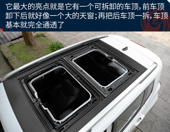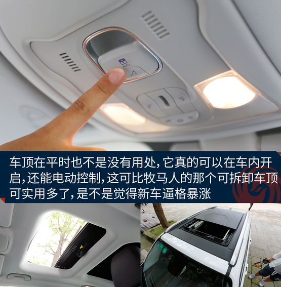 敞篷版車型將普通車型的天窗玻璃全部換成了可拆卸的頂棚,拆卸過程十分方便,即使是女性車主也能輕松拆卸。而且最重要的一點是這個頂棚不只是樣子貨,平時放在車頂時,車內可進行操作,把它變成一個電動天窗來用,是不是感覺特高端?