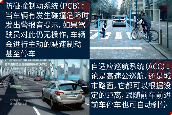 EyeSight駕駛輔助系統(tǒng)是避免事故發(fā)生,此次在中國市場亮相是它的第三代產(chǎn)品,其主要亮點是通過兩個模擬人眼的立體攝像頭,來監(jiān)控距離車輛前方100米以內(nèi),高度在1米以上的人、車輛和物體,以減少傷害為目的的駕駛輔助系統(tǒng);除了距離以外,還可以對方向、高度大小等指標進行識別。它的主要功能分為四大類,分別是防碰撞制動系統(tǒng)(PCB)、車速自適應(yīng)巡航控制系統(tǒng)(ACC)、起步油門誤操作預(yù)防系統(tǒng)和警報與提示系統(tǒng)。