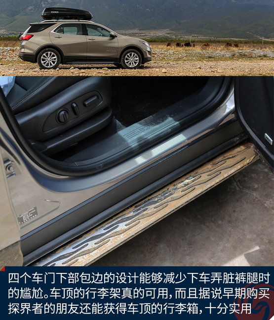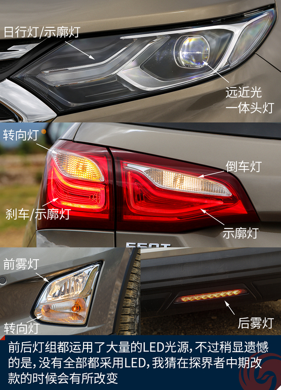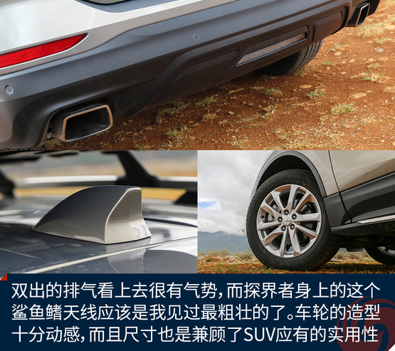 外觀上令我印象深刻的地方有這么幾個(gè),首先前后燈組都運(yùn)用了大量的LED光源,不過(guò)稍顯遺憾的是,沒(méi)有全部都采用LED,我猜在探界者中期改款的時(shí)候會(huì)有所改變。四個(gè)車門下部包邊的設(shè)計(jì)能夠減少下車弄臟褲腿時(shí)的尷尬。車頂?shù)男欣罴苷娴目捎?,而且?jù)說(shuō)早期購(gòu)買探界者的朋友還能獲得車頂?shù)男欣钕?,十分?shí)用。雙出的排氣看上去很有氣勢(shì),而探界者身上的這個(gè)鯊魚鰭天線應(yīng)該是我見(jiàn)過(guò)最粗壯的了。車輪的造型十分動(dòng)感,而且尺寸也是兼顧了SUV應(yīng)有的實(shí)用性。