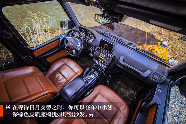 在等待日月交替之時,你可以在車中小憩,方殼子造型的車體,像是一個移動的居所,G 63 AMG中的深棕色皮質座椅,就好似廳堂中的沙發(fā),供人高談、辨析、訴情、吹煙。中控九宮格數(shù)字“點唱機”,不再選擇聒噪的887,而是從中播出歲月的聲音,流出時間的經典,隨著天色變暗,內心也趨于平靜。
