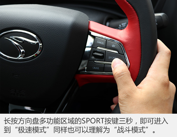 此次DX3 SRG在原有的運(yùn)動(dòng)模式外,還新增了“極速競技模式”同時(shí)開啟方法也很簡單,只需要長摁方向盤右側(cè)的SPORT按鍵三秒,這時(shí)儀表板會(huì)由白色背光變成紅色,表示已經(jīng)進(jìn)入該模式。