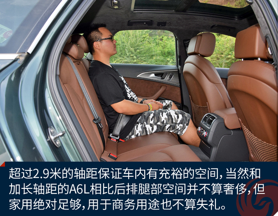 ????????作為中大型豪華車衍生的旅行轎車,A6 Avant提供了充足的乘坐空間,當然后排不會像加長軸距的A6L那么奢侈,不過作為商務接待并不嫌失禮。身高180cm的人在后排足夠舒適,加上旅行車車頂輪廓高挑,后排乘客頭部空間還優(yōu)于三廂轎車。