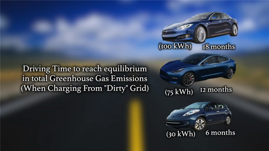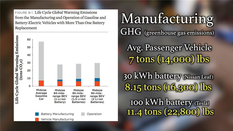 ????????無疑,電池比起傳統(tǒng)內(nèi)燃機(jī)排放的溫室氣體要多的多。普通的內(nèi)燃機(jī)乘用車在生產(chǎn)過程中會(huì)產(chǎn)生7噸的溫室氣體排放,而使用30千瓦時(shí)電池的日產(chǎn)聆風(fēng)會(huì)排放8.15噸溫室氣體。至于100千瓦時(shí)電池的特斯拉Model S P100D更是會(huì)產(chǎn)生11.4噸的溫室氣體。