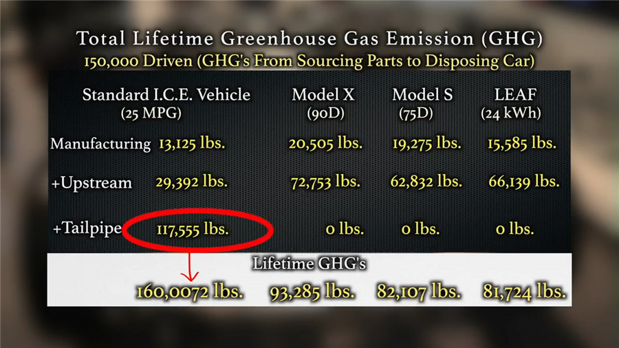 ????????這張表更加清晰,分別統(tǒng)計(jì)了普通內(nèi)燃機(jī)汽車(25MPG=百公里油耗9.4升)、特斯拉Model X 90D、Model S 75D和聆風(fēng)(電池容量24kWh)在車輛生產(chǎn),燃油/電能生產(chǎn)過程以及駕駛使用過程中的排放,可以看到,盡管電動(dòng)車在車輛生產(chǎn)、電能生產(chǎn)過程中產(chǎn)生的排放更高,但行駛工程中的零排放仍然使其在整個(gè)生命周期中的排放更低。
