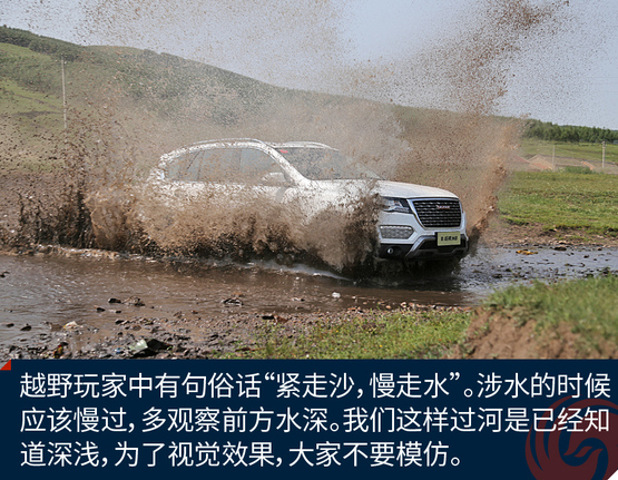 ????????涉水測(cè)試對(duì)于新哈弗H8來(lái)說(shuō)簡(jiǎn)直是小菜一碟,190mm的離地間隙,500mm的最大涉水高度,這條小河完全阻擋不了H8的腳步。俗話說(shuō)“緊走沙,慢走水”是對(duì)于路況不清楚的水域,萬(wàn)一進(jìn)氣系統(tǒng)進(jìn)水,發(fā)動(dòng)機(jī)就會(huì)熄火。所以一定要小心涉水深度。像我們這么莽撞的壓水花,是在水域已經(jīng)探明的情況下。