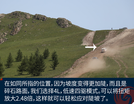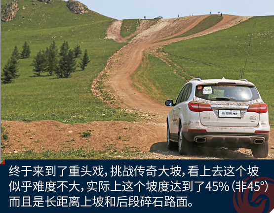 ????????經(jīng)過(guò)刺激的涉水越野,我們終于來(lái)到了此行最難的挑戰(zhàn)地,傳奇大坡。這條上山的土路從圖片上看起來(lái)不陡,實(shí)際上已經(jīng)達(dá)到了45%的坡度。人爬起來(lái)都?xì)獯跤酢6译y度大的原因是兩點(diǎn),一個(gè)是超長(zhǎng)距離的大上坡,另一個(gè)是后端是碎石路面。你想靠沖坡根本行不通,如果動(dòng)力不足最終是無(wú)法登頂?shù)?。H8不僅動(dòng)力充沛而且有4L,低速四驅(qū)模式,而且博格華納雙速TOD可以隨時(shí)分配動(dòng)力傳遞到前后軸,保障了有抓地力的輪胎有驅(qū)動(dòng)力。