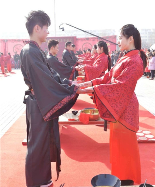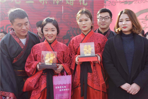 記者在現(xiàn)場看到,16對新人在司儀的引導(dǎo)下,采用中國古典婚禮儀式,有牽紅線、結(jié)發(fā)、拜天地等程序,儀式簡單而隆重,新人家屬、1000多名市民圍觀見證了新人喜結(jié)連理。