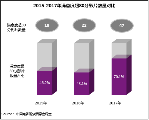 截止賀歲檔,2017年滿意度調(diào)查的重點(diǎn)國(guó)產(chǎn)片數(shù)量為67部,其中滿意度高于80分的影片數(shù)量為47部,占比超70%;而2015、2016年滿意度超80分的影片總數(shù)為40部,占比僅在40%左右。