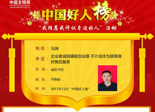 馮坤,男,中共黨員,1974年8月生,河南省周口市太康縣張集鎮(zhèn)人,就職于河南省四通鍋爐有限公司?!按艘姓\(chéng)意,做事要講誠(chéng)信,做事要先把人做好?!笔邱T坤創(chuàng)業(yè)成功的秘訣,就是誠(chéng)信。