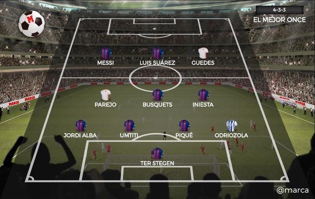 在球迷票選的西甲半程最佳11人中,巴薩占據(jù)了8席:特爾施特根、阿爾巴、烏姆蒂蒂、皮克、布斯克茨、伊涅斯塔、梅西和蘇亞雷斯都入選了這個陣容。