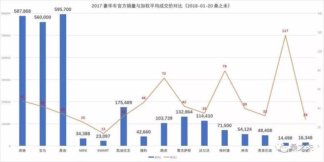 銷售的數(shù)量固然重要,但是銷售質(zhì)量也是評估銷售力不能忽視的重要指標(biāo)。衡量銷售質(zhì)量,“加權(quán)平均成交價”和“單車?yán)麧櫋边@兩個重要參數(shù),也許讓我們更直觀的看到車企的銷售能力與經(jīng)銷商單店經(jīng)營質(zhì)量。這些更微觀的數(shù)據(jù)往往更能反映銷售公司及其經(jīng)銷商體系的銷售能力及水平?!凹訖?quán)平均成交價”反映車企的產(chǎn)品力與銷售公司的銷售能力,車企賣掉的車越多,單車價格越貴,品牌就越具有競爭力,反之就需要考慮改進(jìn)產(chǎn)品,提升銷售管理能力。“單車?yán)麧櫋敝附?jīng)銷商銷售新車獲取的利潤,不含衍生利潤,一般在-4%-7%之間,如果單車?yán)麧櫝^-2%,廠家需要考慮對經(jīng)銷商進(jìn)行補貼,如果利潤超過7%,車企就會調(diào)整經(jīng)銷商浮動返利。下面我們通過這兩個指標(biāo),來看哪些豪華車品牌在2017年表現(xiàn)更具實力。