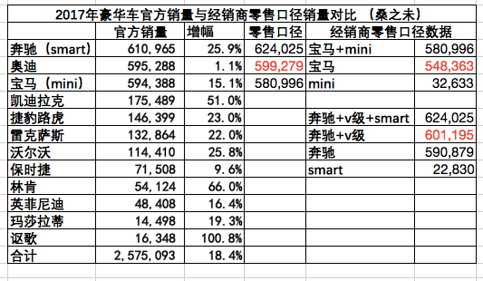 如果以經(jīng)銷商終端零售口徑統(tǒng)計,奔馳(含smart)2017年銷量為624,025輛,其中奔馳品牌(含v級車)為601,195輛;奧迪品牌為599,279輛;寶馬(含Mini)為580,996輛,其中寶馬品牌為548,363輛;如果以經(jīng)銷商終端零售口徑計算,奔馳品牌(含v級車)在2017年豪華車終端零售市場獲得銷售冠軍。