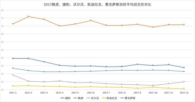 凱迪拉克、捷豹路虎、雷克薩斯、沃爾沃四個品牌銷量在10萬輛以上為第二陣營。除路虎外,捷豹因進(jìn)口F-pace帶動其成交價上揚,隨著XE國產(chǎn)上市銷售,捷豹銷量有望進(jìn)一步增長,價格進(jìn)一步下探;以銷售進(jìn)口車型為主的雷克薩斯,今年銷量質(zhì)量不錯,庫存時間短,資金周轉(zhuǎn)快,多數(shù)以訂單方式銷售,加權(quán)平均價在42萬上下,成交價格走勢平穩(wěn),經(jīng)銷商今年利潤也很豐厚。沃爾沃在新款車型的帶動下,成交價格開始上揚;凱迪拉克今年銷量增速較快,通過下圖我們可以看到,凱迪拉克基本依靠低價獲取銷量的增長,成交價格進(jìn)一步走低,經(jīng)銷商的利潤需要依靠廠家補貼。