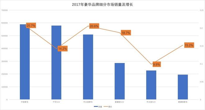 2017年豪華車市場中六大細(xì)分市場(中大型轎車、中型轎車、緊湊型轎車、中大型SUV、中型SUV、緊湊型SUV)占據(jù)豪華車全年93%的銷量,環(huán)比增長17.3%,市場集中度進(jìn)一步提升;豪華車企業(yè)如果想與市場同步增長,就不得不在這個六個細(xì)分市場投放車型,并提升產(chǎn)品競爭力。