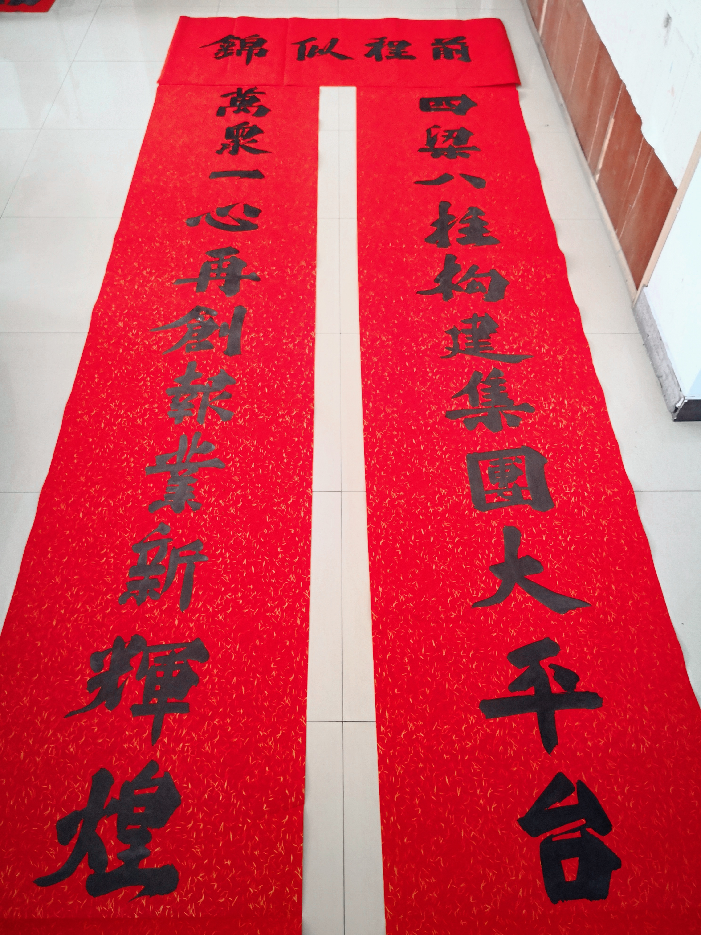 中華龍都網(wǎng)訊(周口報(bào)業(yè)全媒體記者 王晨)無(wú)聯(lián)不成春,有聯(lián)春更濃。2月3日,青年書法家邢懷章潑墨揮毫,為周口報(bào)業(yè)傳媒集團(tuán)書寫巨幅春聯(lián),字大如斗,給周口報(bào)人送去新春祝福。