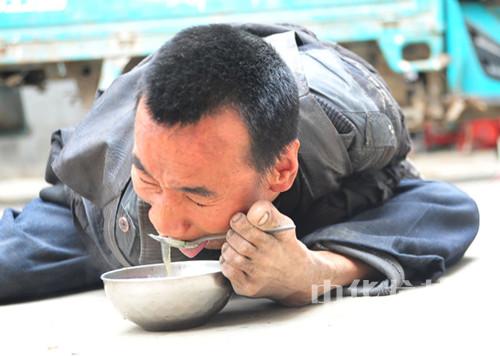 媽媽乘上一碗放在地上,紅印坐在墊子上,用腳夾著勺子,彎下腰來吃得很香??吹郊t印吃飯那么費(fèi)力,在場(chǎng)人心里酸酸的,為紅印自強(qiáng)不息所打動(dòng)著。可是當(dāng)初娘倆可沒少流眼淚,李新蘭發(fā)現(xiàn)兒子兩只腳是靈活完好的,就開始訓(xùn)練他用腳吃飯、洗臉。養(yǎng)大一個(gè)正常的孩子尚且不易,何況是張紅印這樣的孩子?李新蘭一遍遍地教,年幼的張紅印一遍遍地學(xué)。難為到受不了時(shí),娘倆就抱在一起哭。