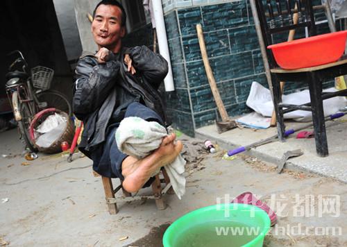 “這孩子40多年來,沒住過院,沒打過針,頭疼發(fā)燒會(huì)給媽媽示意,拿幾片藥一吃就好,這孩子命硬,一冬天也不洗回澡,到夏天爸爸媽媽幫他洗洗,有時(shí)候衣服一月才換一次?!编従訌埓髬屨f道。現(xiàn)在紅印可以靈活的用雙腳幫媽媽做一些事情了。