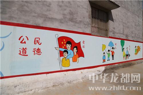 當(dāng)日16時許,記者在該村看到,干凈整潔的水泥路像玉帶在村中盤旋,街道兩側(cè)栽植不久的小樹在向人們招手,坑塘四周干凈整潔,綠樹環(huán)繞,塘水清澈,梳理有致,房前屋后干凈整潔……天空中雖然下著雨,但是記者遠(yuǎn)遠(yuǎn)的就聽到了群眾的談笑聲和機(jī)械的轟鳴聲,走近,原來是村民們不顧天氣下雨,依然在自發(fā)地進(jìn)行道路清理工作。記者看到,該村墻體文化更讓村子增加了很多的“內(nèi)涵”。