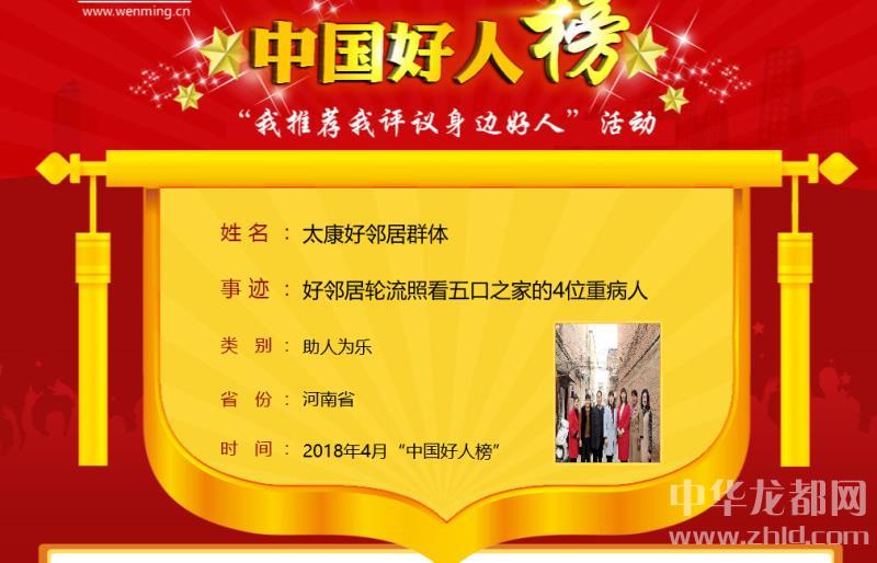 中華龍都網(wǎng)訊(周口報(bào)業(yè)全媒體記者 馬治衛(wèi))4月28日上午,4月中國(guó)好人榜發(fā)布儀式暨全國(guó)道德模范與身邊好人現(xiàn)場(chǎng)交流活動(dòng)在天津市和平區(qū)舉行。太康縣“好鄰居群體”榮登4月份中國(guó)好人榜。