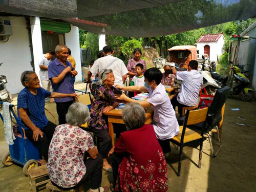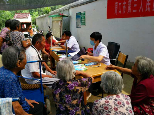 8時40分許,醫(yī)護人員在文莊社區(qū)衛(wèi)生室的醫(yī)務(wù)人員的協(xié)助下搭起了臨時義診臺,為村民測血糖、量血壓,并針對測量結(jié)果給出用藥指導(dǎo),為村民提供健康咨詢服務(wù),現(xiàn)場解答健康問題,并根據(jù)部分村民身體狀況提出合理的防治建議。