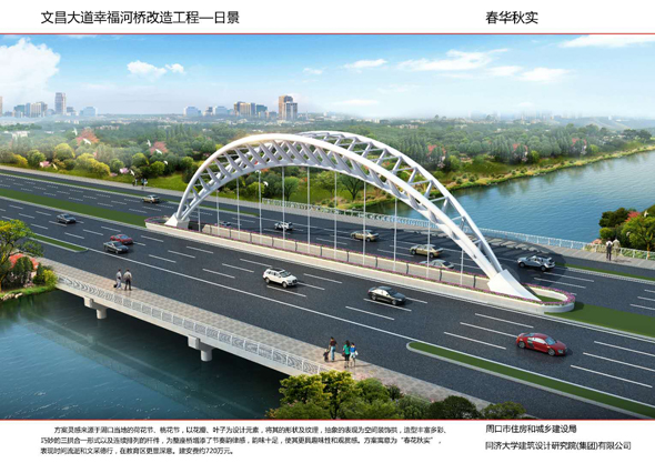 周口大道沙潁河橋景觀改造,設(shè)計造型簡單柔美,如行云流水,同時與沙潁河景觀帶相融合,給城市增添了生機(jī)與活力。周口大道賈東干渠橋以荷葉為設(shè)計元素,造型簡約而不失細(xì)節(jié)。周口大道流沙河橋造型簡潔大氣,線條流暢,像一條青龍游弋在水面上。文昌大道幸福河橋以花瓣、葉子為設(shè)計元素,造型豐富多彩。文昌大道流沙河故道橋在中分帶位置修建花壇,花壇造型莊重古樸,景石造型端莊沉穩(wěn)。太清路流沙河橋以古建斗拱、窗花為元素,造型儒雅大方。太清路洼沖溝2號橋以“輻轂相依”為名,既融合環(huán)境,又有團(tuán)結(jié)、合作的寓意。太清路賈魯河橋,增加了景觀造型,使人們可以重溫當(dāng)年賈魯河的美好畫卷。彭新莊橋以柳葉為元素,預(yù)示著留住賓客與送別親友的不舍之情的雙重含義。