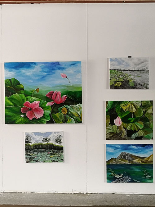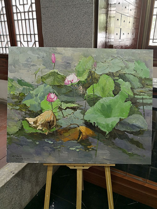 在龍湖荷花盛開的季節(jié),女詩人油畫家三色堇、娜仁琪琪格、愛斐兒、暖玉、白芳芳、劉文文一行6人,來到周口進(jìn)行寫生觀摩,開展老莊文化交流、伏羲太極文化傳播等公益活動(dòng)。7月17日上午開展女詩人油畫家寫生作品展,豐富多樣的活動(dòng)成為淮陽荷花節(jié)一濃墨重彩的一筆。