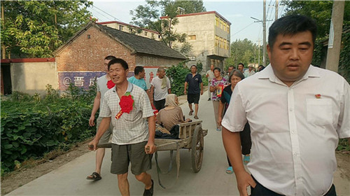當(dāng)日早上,秋渠鄉(xiāng)高小橋行政村牛橋和孫大莊自然村,鄉(xiāng)村干部打著橫幅、孝順兒、媳胸帶紅花,用架子車?yán)先?,后面跟著圍觀的村民,通過(guò)隆重“接老人回家”活動(dòng),激勵(lì)更多人孝老愛(ài)親。