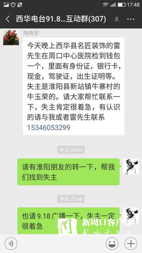 很快,一條尋找失主的愛心信息,便通過無線網(wǎng)絡,乘著夜色翅膀,在豫東大地的西華縣政協(xié)群、西華縣非公黨工委群、西華縣城市管理群、西華縣愛心粥屋群、西華電臺91.8互動群、周口市個私協(xié)會系統(tǒng)群、淮陽縣非公黨工委群、淮陽縣文明辦群、淮陽縣城市管理群等微信群迅速散發(fā)開來。很多群友進行轉(zhuǎn)發(fā)、點贊。
