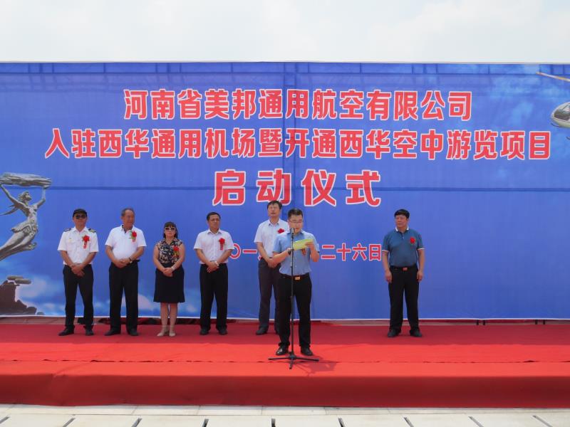 8月26日,河南省美邦通用航空有限公司入駐西華通用機(jī)場(chǎng)暨開通西華空中游覽項(xiàng)目啟動(dòng)儀式在西華縣南廣場(chǎng)舉行,西華縣委常委、常務(wù)副縣長(zhǎng)王獻(xiàn)超,西華縣人大常委會(huì)副主任龐友敬,西華經(jīng)開區(qū)管委會(huì)主任宋廣良,西華經(jīng)濟(jì)技術(shù)開發(fā)區(qū)城市投資有限公司總經(jīng)理朱洪江;美邦控股集團(tuán)總經(jīng)理、河南省美邦通用航空有限公司董事長(zhǎng)王洪濤等出席啟動(dòng)儀式。