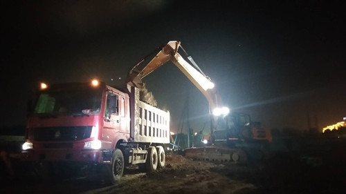 在德和家園施工現(xiàn)場,雖近22時,挖掘機依然揮舞著鐵臂在不停地挖土,渣土車來來往往地運送著土方,靜謐的夜空在德和家園的施工現(xiàn)場也躁動起來。