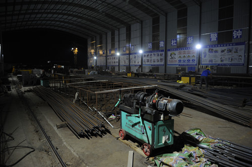 當晚21時許,記者在泰和家園施工現(xiàn)場看到,鋼筋加工棚的工人們正在進行鋼筋的切割,他們在為明天施工準備鋼筋材料。A1#樓正在進行墊層的澆筑工作,A8#樓正在進行負一層及周邊地庫的鋼筋綁扎及模板加固工作,A9#樓正在進行負一層墻柱鋼筋及模板內(nèi)架搭設工作?,F(xiàn)場2臺鋼筋切割機在不停地運轉(zhuǎn),9臺塔吊在持續(xù)工作,40余名施工人員在場地內(nèi)各司其職,緊張而有序地趕進度,整個施工現(xiàn)場如火如荼。