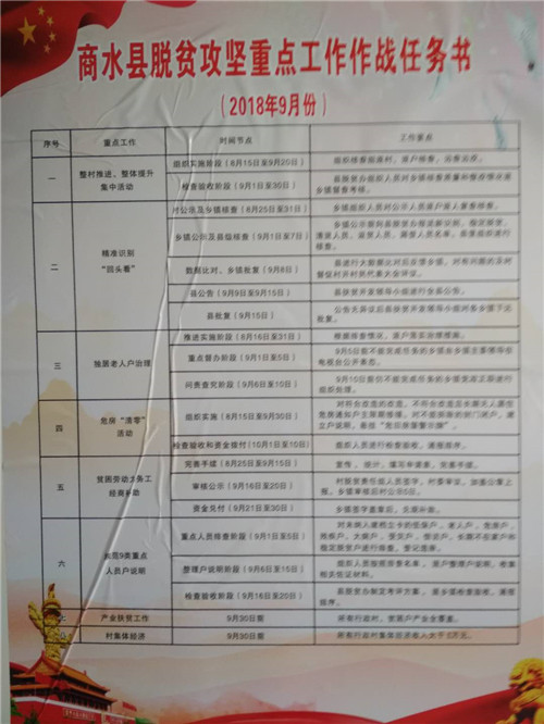 “‘脫貧攻堅(jiān)重點(diǎn)工作作戰(zhàn)任務(wù)書’既是作戰(zhàn)圖、也是軍令狀,每個(gè)時(shí)間點(diǎn)開展哪些工作、達(dá)到什么效果、采取何種措施,都在‘作戰(zhàn)任務(wù)書’上顯現(xiàn)了出來?!?月5日上午,商水縣練集鎮(zhèn)朱集村脫貧責(zé)任組組長陳書敬指著張貼在村辦公室內(nèi)的“商水縣脫貧攻堅(jiān)重點(diǎn)工作作戰(zhàn)任務(wù)書”說。