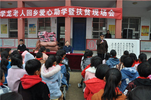 雖然身在北京,但于學(xué)龍老人的心始終牽掛著故鄉(xiāng)。11月5日,他回到老家商水縣黃寨鎮(zhèn),用自己的退休金,為母校埠口小學(xué)的孩子送來一批嶄新的書包和自己創(chuàng)作的書法精品。“親愛的小校友們,你們背上書包上學(xué)就更方便了,希望你們好好學(xué)習(xí)、茁壯成長(zhǎng),將來成為社會(huì)棟梁,報(bào)效國(guó)家?!庇趯W(xué)龍對(duì)孩子們說。