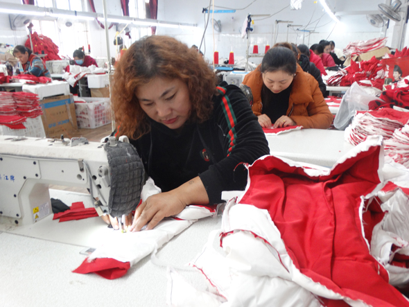 11月11日,沈丘縣周營鎮(zhèn)慧恩服飾來料加工點,當(dāng)?shù)厥畮酌羰亍扒上眿D”正忙著加工訂單兒童冬季服裝。