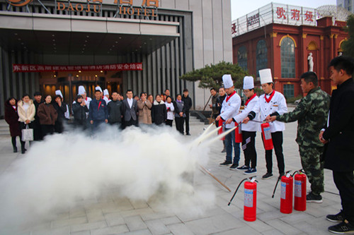 在培訓現(xiàn)場,為更好地將學到的知識與實踐相結(jié)合,大隊宣傳人員組織參訓人員開展了實地滅火消防演練,酒店全體員工分批次輪番上陣,通過使用滅火器及時迅速地撲滅火災(zāi)操練,提高參訓人員正確規(guī)范使用滅火器材的能力,達到了良好效果。