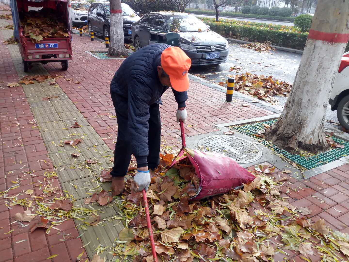12月3日晚上,周口市中心城區(qū)風(fēng)急雨驟,樹葉落了一地。4日上午天放晴,環(huán)衛(wèi)工人紛紛上街清掃落葉。負(fù)責(zé)興旺路的環(huán)衛(wèi)工人告訴記者,他以前兩個小時就能打掃完,而當(dāng)天他干了3個小時還沒有干完,估計還得再干1個多小時。圖為環(huán)衛(wèi)工人在清掃落葉。