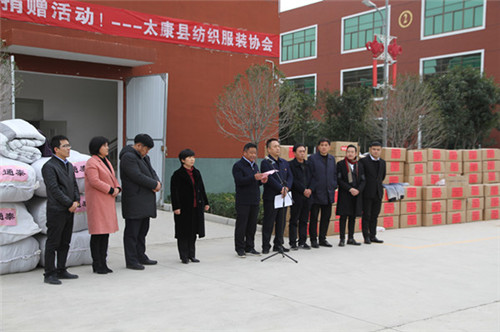 太康縣委副書記、政法委書記王程清在致辭中指出,扶貧濟困、樂善好施是中華民族的傳統(tǒng)美德,通泰紡織、銀鑫棉業(yè)、萬利源棉業(yè)等縣紡織協(xié)會成員單位通過捐款捐物、產(chǎn)業(yè)幫扶、就業(yè)幫扶、基礎(chǔ)設(shè)施幫扶等多種形式投入到脫貧攻堅行動中,幫助貧困群眾發(fā)展生產(chǎn)、改善生活條件、擺脫疾病困擾、完成學業(yè)夢想、為貧困群眾早日脫貧貢獻出自己的一份力量,并為他們捐贈棉衣棉被的善舉表示感謝。
